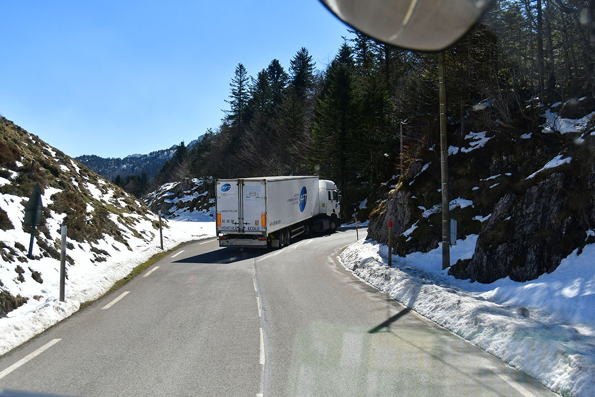 Mardi 17 mars, départ à 7h45 direction Figeac, Villefranche de Rouergue, Caussade, Montauban, Auch, Tarbes, Pau et Oloron Ste Marie au pied des Pyrénées. Des routes très techniques entre Tulle et Caussade où les élèves ont pu travailler l’utilisation du ralentisseur et la boîte de vitesses en mode manuel. Un avant-goût de la journée du mercredi…
