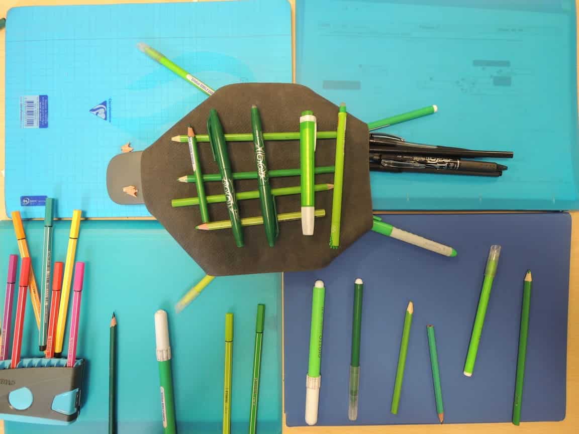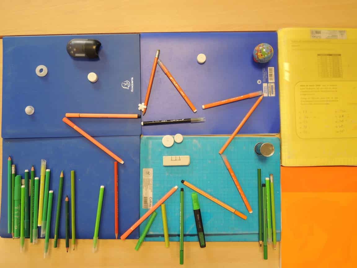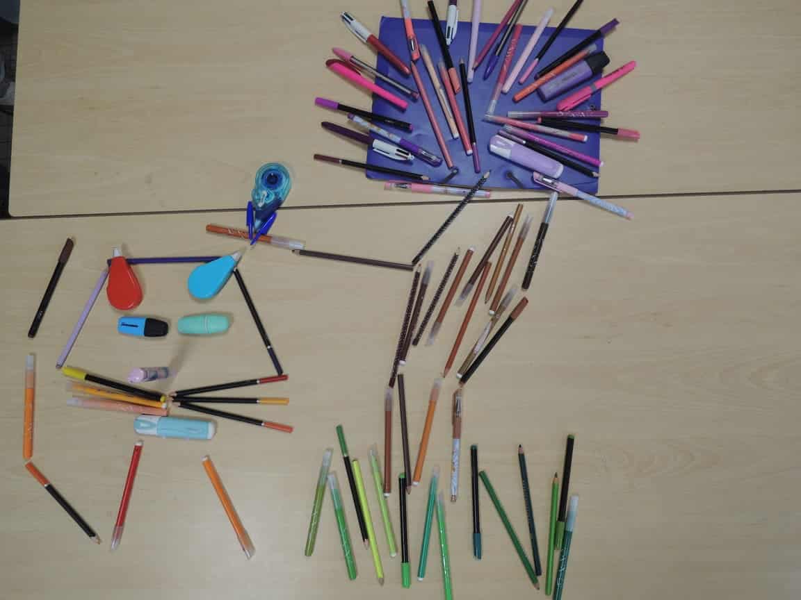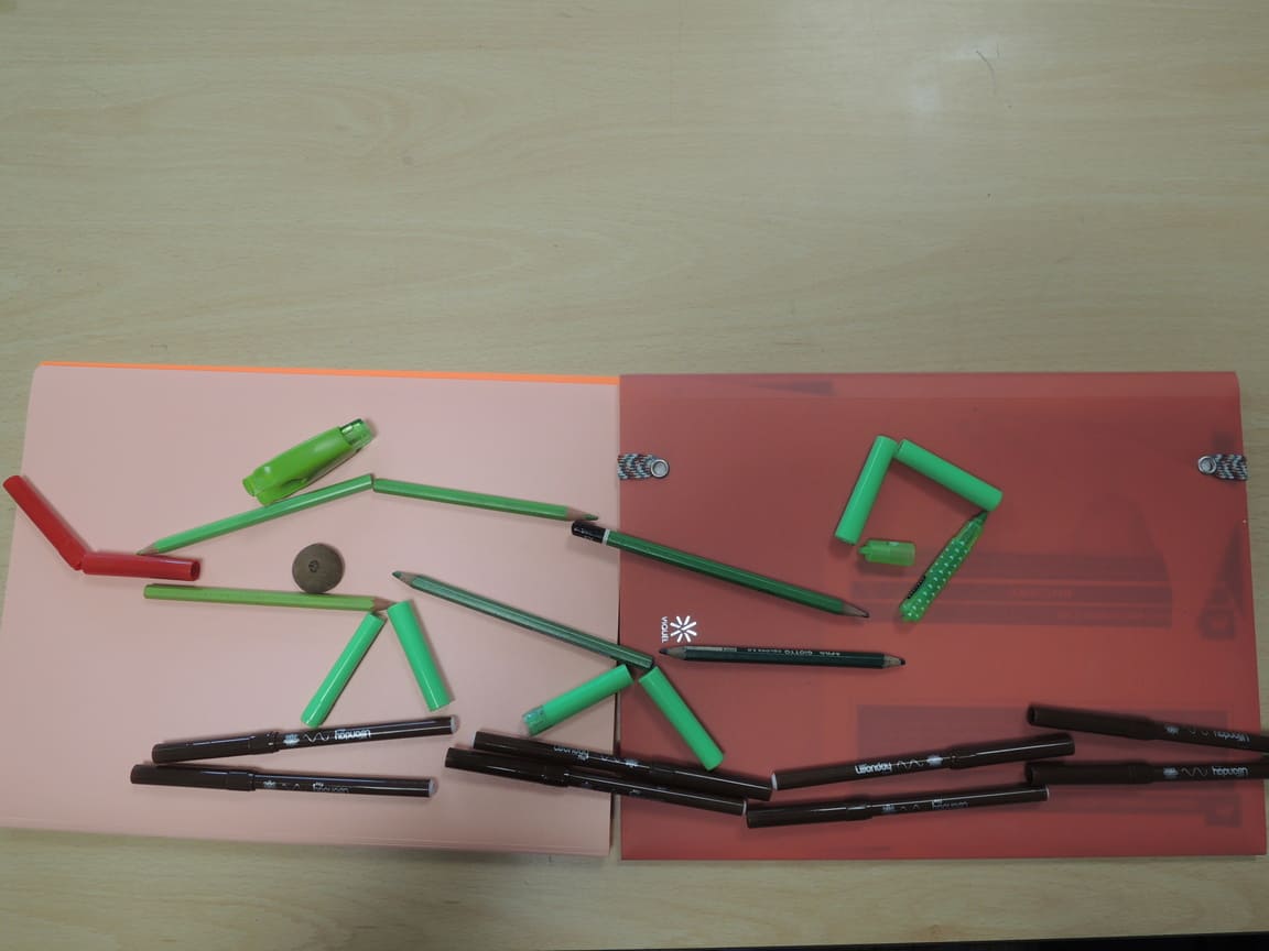 Avec des objets de votre trousse, représentez un animal et son environnement. Votre travail collectif sera photographié en plongée.
