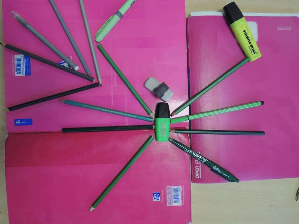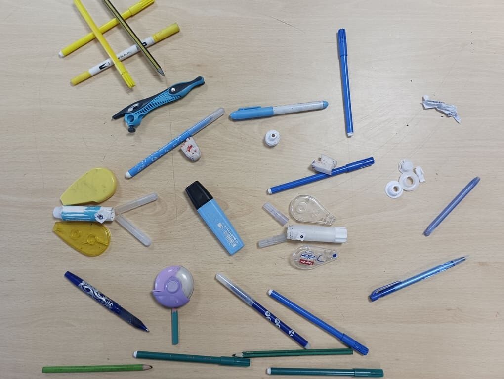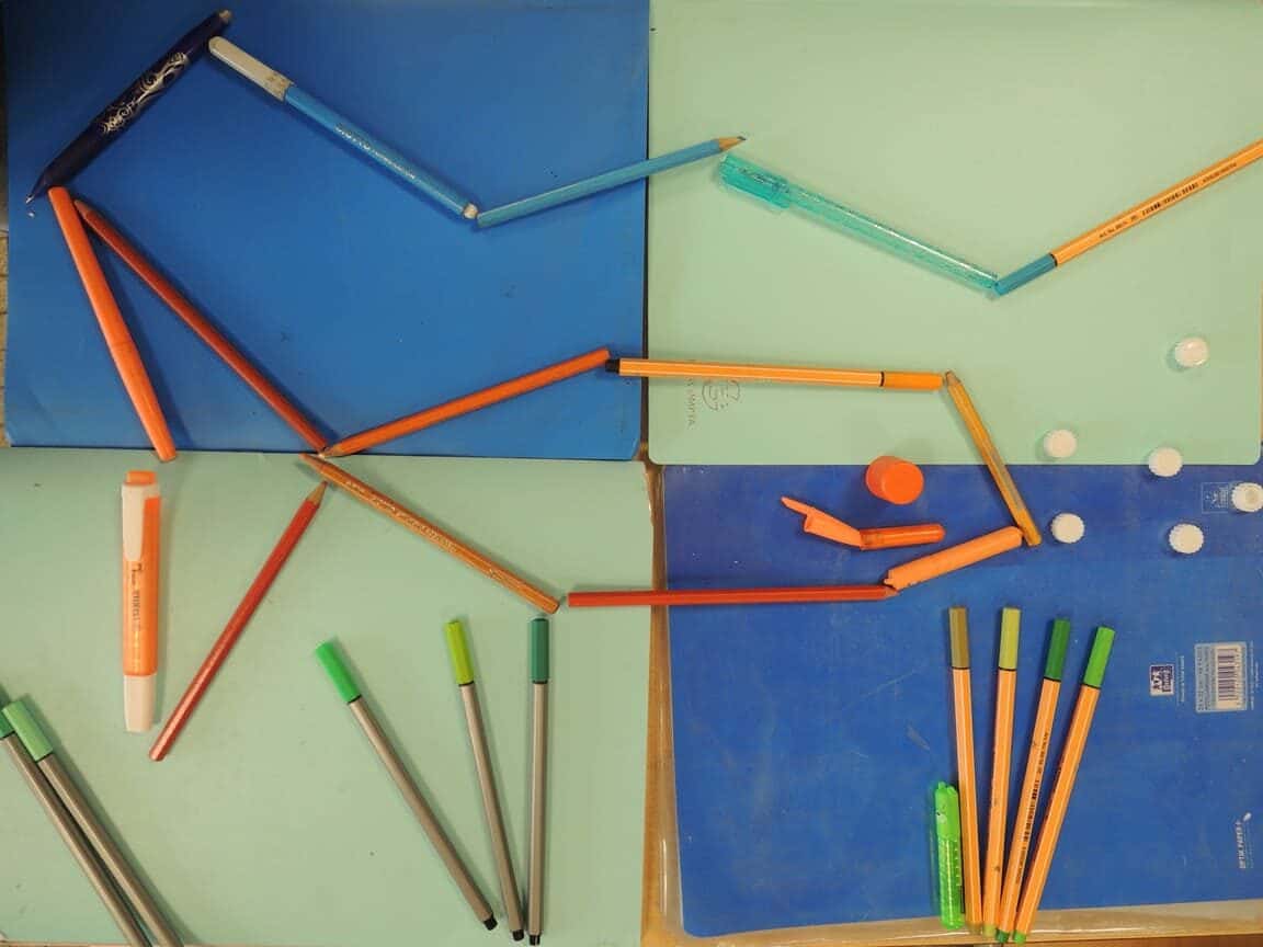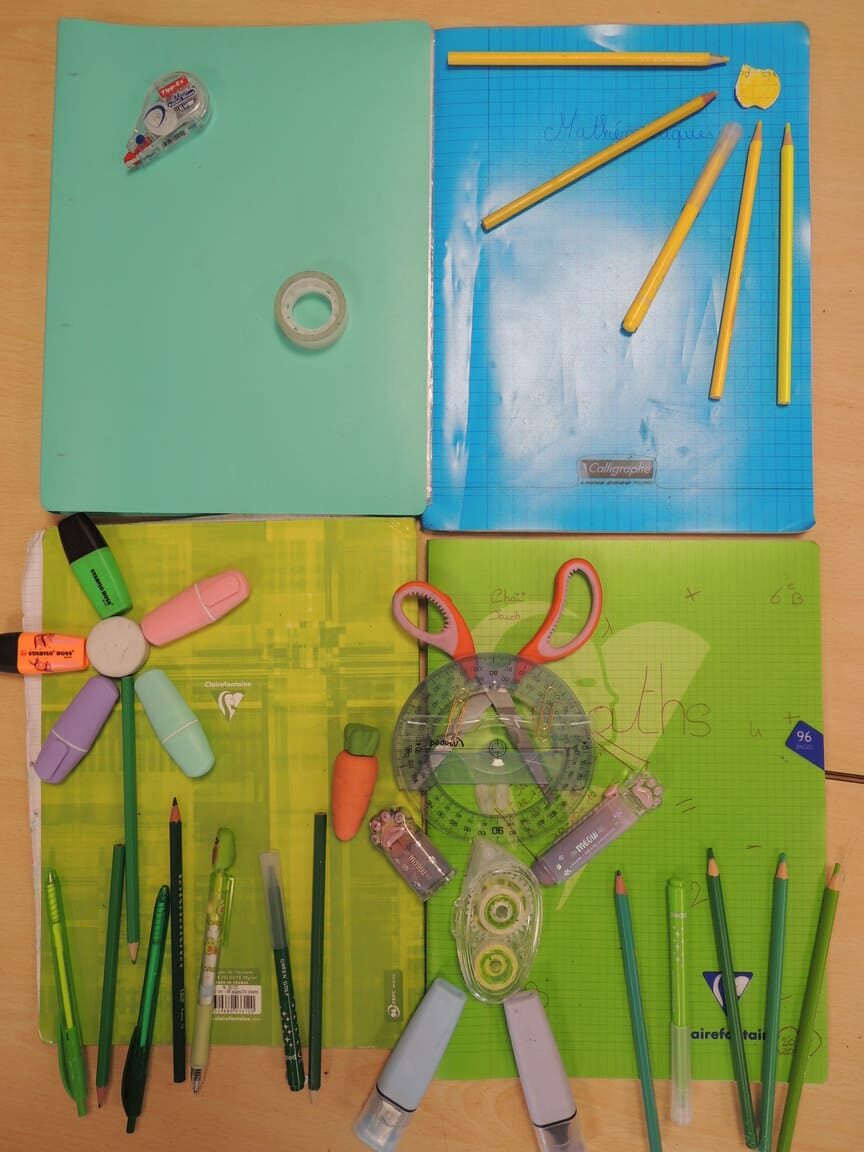 Avec des objets de votre trousse, représentez un animal et son environnement. Votre travail collectif sera photographié en plongée.